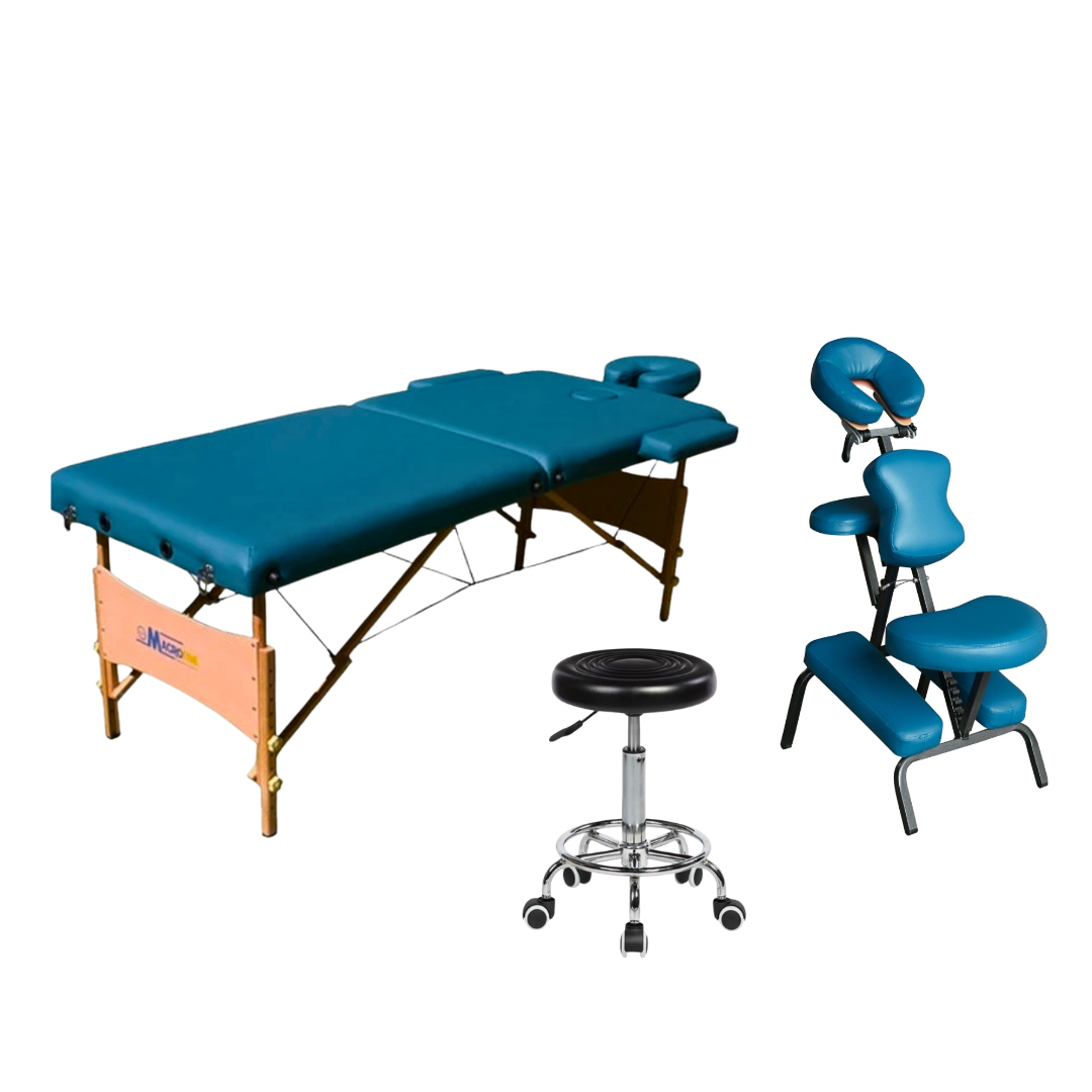 Pack masaje camilla 2 cuerpos + silla de masaje turquesa + taburete giratorio